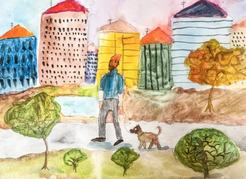 На рисунке – обычный день, какой часто видишь в спальном районе. Прохожий выгуливает своего лохматого друга. Собака, угольно-чёрная, кажется, что породы дворняга, но с очень умным взглядом. Идут они не спеша, по знакомым улочкам.