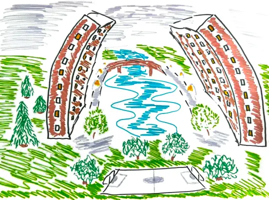 Много парков и и лесопарков. Много спортивных площадок. Много зон для прогулок и отдыха. Красивые освещённые набережные. Дома в одной стилистике. Ну и, конечно, никакого личного транспорта в самом прекрасном и перспективном мегаполисе.