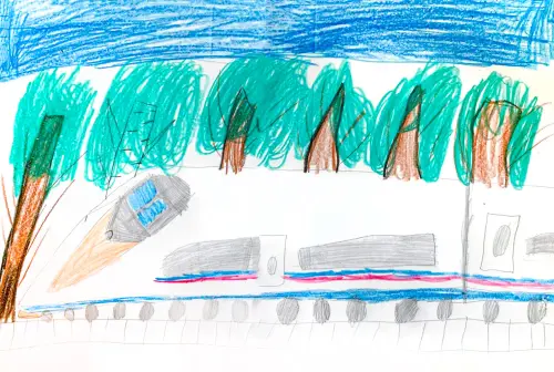 Я очень люблю путешествовать вместе со своими родителями в разные города России на скоростных поездах. На рисунке изображён Ленинградский вокзал, рядом с которым стоит скоростной поезд «Сапсан». Вокзал изображён с характерными архитектурными деталями, а поезд - в движении, что создаёт ощущение скорости и динамики.