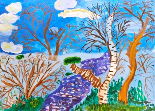 На картинке изображён волшебный парк, где деревья танцуют под музыку ветра. Небо ярко-голубое, как мороженое, а облака пушистые, как ватные шарики. В центре парка растёт большая берёза с белыми стволами и коричневыми полосками, как будто кто-то нарисовал её кисточкой. Рядом с ней стоит дерево с коричневым стволом, оно похоже на старого мудрого друга, который наблюдает за всем вокруг.