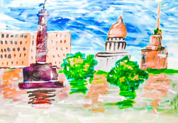 На картинке изображён красивый городской пейзаж у воды. В центре стоит высокая колонна, как будто она охраняет этот уголок города. Вокруг неё растут зелёные деревья, которые создают тень и уют.