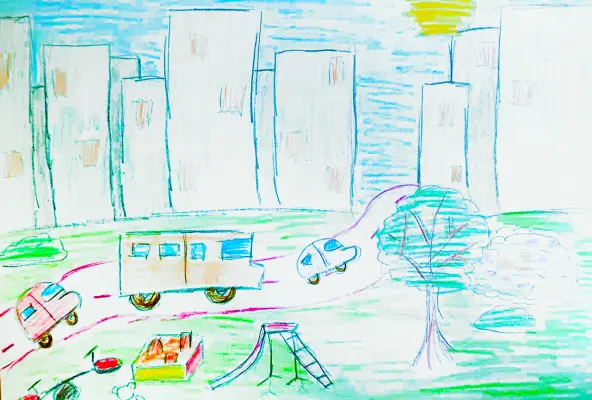 Изобразила детскую площадку, горку и песочницу для детей. А ещё машины и дорогу, по которой ездят автомобили. И красивые клумбы с цветами и растениями.