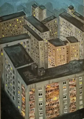 На картине «Городские крыши» изображены дома с высоты птичьего полёта. Зрителю открывается вид на городской пейзаж, главным героем которого стала архитектура.