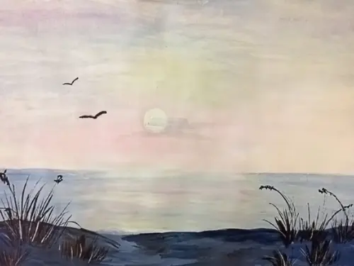 На картинке изображён вечерний пляж. Небо окрашено в нежные розовые и жёлтые оттенки, как будто кто-то разлил краски по небу. Солнце медленно опускается за горизонт, оставляя после себя тёплый свет.