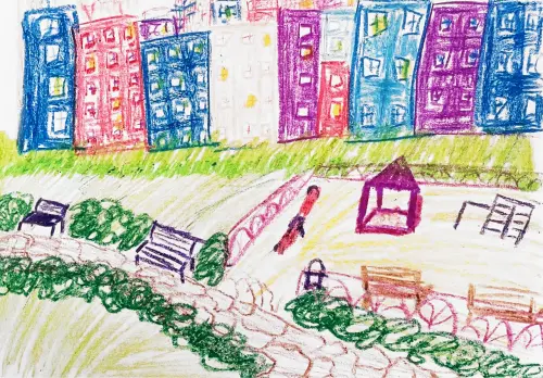 Я нарисовала свой двор: пейзаж с домами, деревьями, скамейками и дорогой. А ещё детскую площадку. Использовала яркие цвета: зелёный, синий, розовый и фиолетовый.