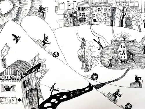 Празднование масленицы во дворе в Бескудниковском районе. Традиционные игры и забавы и вкусные блины с горячим чаем. Работа выполнена в графике с использованием маркеров и ручек.