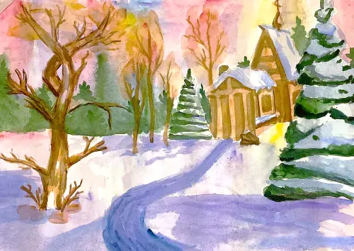 Перед зрителем открывается величественная картина зимней усадьбы, где пушистый белый снег окутал землю, деревья и само здание, превратив привычный пейзаж в настоящую зимнюю сказку.