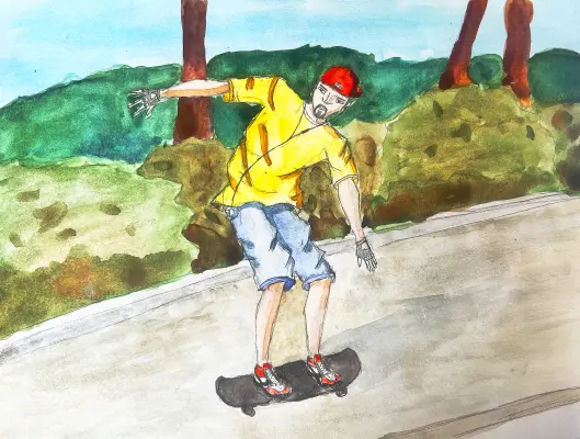 Парень, увлечённый ритмом любимой музыки, несётся по дорожке на скейте. Ветер в лицо, наушники плотно в ушах – он полностью погружён в свой мир, где есть только он, скейт и дорога, убегающая вдаль. Солнце играет бликами на асфальте, а в наушниках качает бодрый бит. Кажется, что ничто не может отвлечь его от этого момента свободы и скорости. Лёгкий толчок ногой – и скейт снова набирает ход, унося его дальше от суеты и забот.