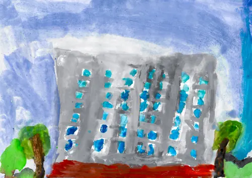 Это дом, в котором я живу всю жизнь. Его недавно отремонтировали. В нём 9 этажей. Рядом есть детская площадка, стоянка для машин, отделение полиции и церковь.