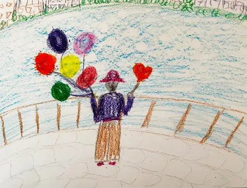Я нарисовал человека в шляпе и фиолетовой одежде, который держит кучу разноцветных шаров – оранжевых, жёлтых, розовых и ещё разных! Он стоит у ограды, а позади – водоём или небо, всё в синем цвете.