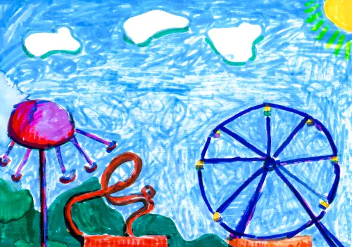 Обожаю аттракционы! Готова кататься на них постоянно. Правда, это очень редко получается. Не уверена, что очень похоже нарисовала, но пусть это будет парк моей мечты.