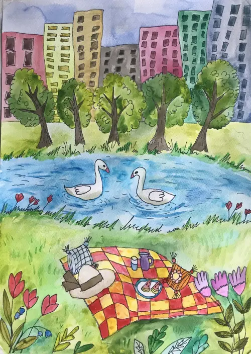 Мы с мамой часто ходим в парк около дома на пикник. Берём с собой покрывало, перекус, садимся около пруда и наслаждаемся видом. В парке много цветов, которые я нарисовала на своей картине.