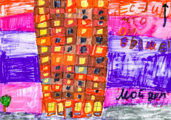 Мы недавно переехали в новый высокий и красивый дом по реновации. Теперь я живу не на первом, а на очень высоком этаже! Мне очень нравится расцветка моего дома, аккуратный двор и много свободного места.