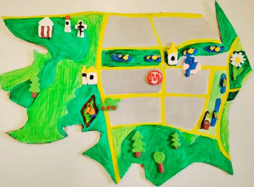 Мой район Северное Бутово. Много разных интересных мест можно посетить в моем районе. Я очень люблю гулять в парке Битца и в Бутовском парке, кормить уток и играть на площадках. Еще в нашем районе есть очень красивые храмы — храм Великомученицы Праскевы Пятницы и церковь Илии Пророка. В нашем районе много памятников — Мемориал ветеранам и жертвам боевых действий, памятник Героям Великой Отечественной войны, памятник Героям войны 1812 года. А еще в нашем районе есть лыжная и вело-трасса «Поляны», и Ботанический сад ВИЛАР, усадьба «Знаменские садки» и, конечно, наша любимая школа «Синяя птица». Все эти интересные места я показала на своем рисунке, используя гуашь и пластилинографию. чтобы рисунок получился ярким и объемным.