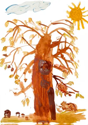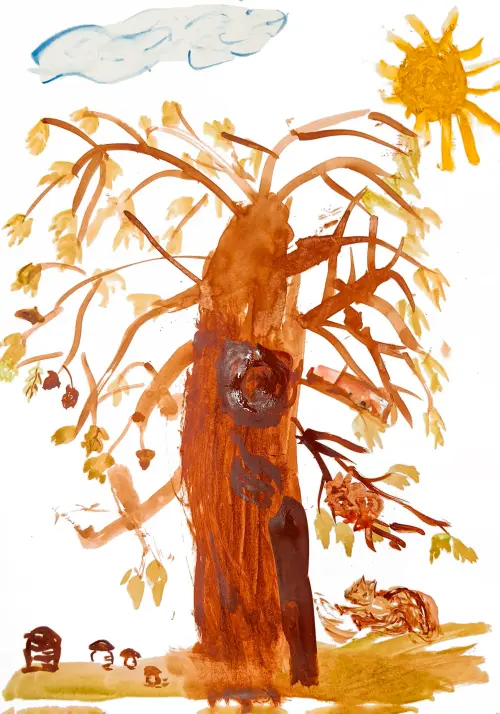 Я очень люблю гулять в Лефортовском парке и кормить белочек. Это моё любимое место в Москве, и поэтому я его нарисовал. А внизу я нарисовал лисичку, которая смотрит на белочку.