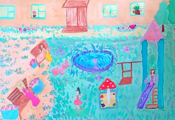 В нашем дворе очень красивая детская площадка с зелёными лужайками и цветами. На ней любят играть дети и отдыхать взрослые. Мы здесь общаемся, веселимся и заводим новых друзей.