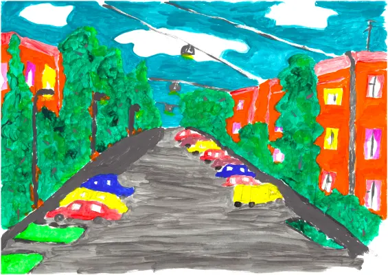 Я нарисовала свою любимую улицу, на которой живу. По моему мнению, это самая красивая, зелёная, тихая улица во всей Москве. На этой улице растёт много деревьев, кустарников и цветов.