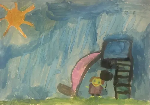 В этом году лето дождливое и холодное, но это не повод унывать и сидеть дома! Я со своими братьями и родителями часто гуляю на своих любимых московских площадках, а в случае дождя мы прячемся под горкой! Я люблю свой район, и мне очень нравятся детские площадки во дворах и парках!