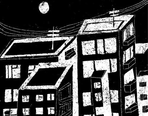 Индустриальный пейзаж. Формат работы - А3. Техника граттаж. Непечатная графика. Графическая работа с городским мотивом. Вид из окна на многоэтажки мегаполиса. Отличная работа с хорошим тоновым разбором и сложной композицией.