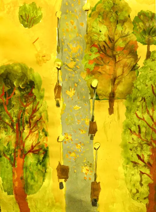 Работа формата А2. Техника гуашь. Осенний пейзаж парка «Кузьминки». Интересная вертикальная композиция. Приятная сдержанная гамма. Работа полна умиротворения и покоя. Хорошо передает состояние сюжета.