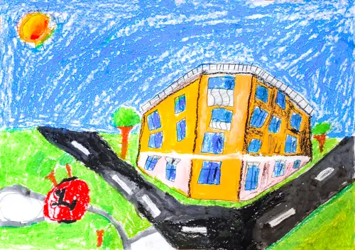 На моём рисунке — яркий жёлтый дом с голубыми окнами, стоящий около дороги. Вокруг зелёная трава, деревья и яркое солнце. Я хотел показать тёплый, солнечный день и место, где хорошо и спокойно.