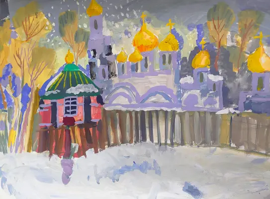 Формат А3. Живописный этюд. Зимний пленэр. Фрагмент Новодевичьего монастыря в Москве. Работа на состояние времени года. Техника бумага, гуашь. Сложная цветовая гамма.