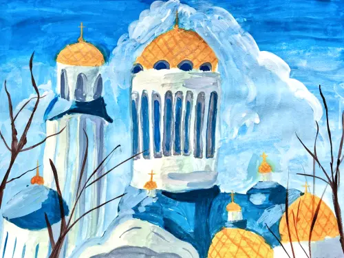 Гуашь. Храм Собора Московских Святых является одним из главных украшений районов Алтуфьево и Бибирево. Прекрасная архитектура в греческом стиле радует глаз и наполняет гармонией.