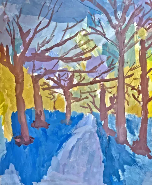 Красивая зимняя работа на состояние природы. Зимний пейзаж. Работа выполнена по теме «Прогулки в любимых местах». Формат работы А3. Техника «гуашь». На работе изображена зимняя алея в парке Кузьминки.