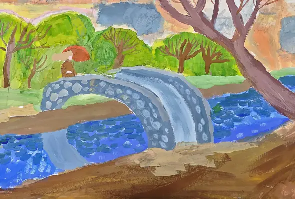 Сюжетная композиция. Одинокая фигура девушки с зонтиком стоит на Горбатом мостике в парке Кузьминки. Мелкий моросящий дождик и закатное тёплое небо придаёт композиции особый колорит. Работа формата А2, техника «гуашь».