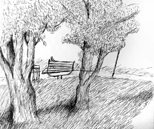 Пленэр. Ученическое задание на тему «городской пейзаж». Графическая работа. Техника исполнения - тушь, перо. Формат А3. При помощи графического приёма очень изыскано выполнена фактура деревьев и травы. Это придает зарисовке лёгкость и воздушность.