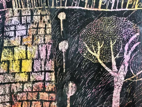 Очень непростую технику для своей работы выбрала Эмилия. Сюжетом для картины стал Есенинский бульвар. На работе мы видим брусчатую дорожку с фонарями и деревья с большой кроной . Работа выполнена в технике «граттаж», формат А3.