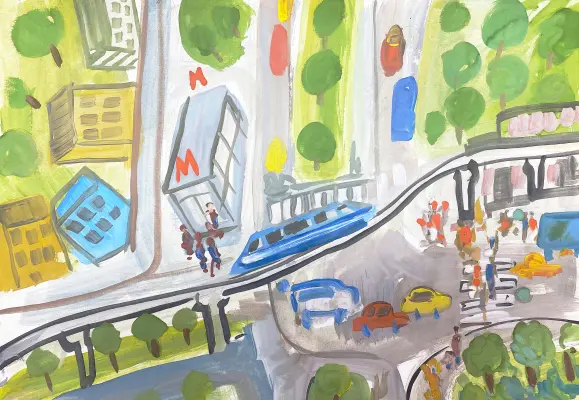 Нарисовала картину своего района! Сначала изобразила дорогу, по которой ездят разноцветные машины. Над ними пролетает монорельс. По бокам дороги выстроились дома. Перед домами раскинулась зелёная травка, дорожки и лавочки. Повсюду кипит жизнь: ходят люди, играет музыка, светит солнце. Моё изображение вышло ярким и радостным — точно отражает любимое место!