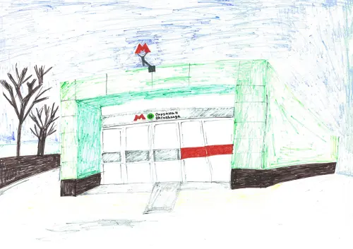 На рисунке изображён вход на станцию Московского метрополитена — "Окружная", которая относится к 10-й линии (Люблинско-Дмитровская линия), что обозначено зелёным кружком с цифрой 10. Над входом виден красный логотип московского метро в форме буквы "М". Архитектура входа выполнена в современном стиле — фасад здания облицован светло-зелёными панелями.