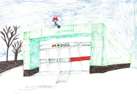 Работа выполнена цветными карандашами и фломастерами. Картина передаёт повседневную, но важную часть городской жизни — общественный транспорт и его инфраструктуру.