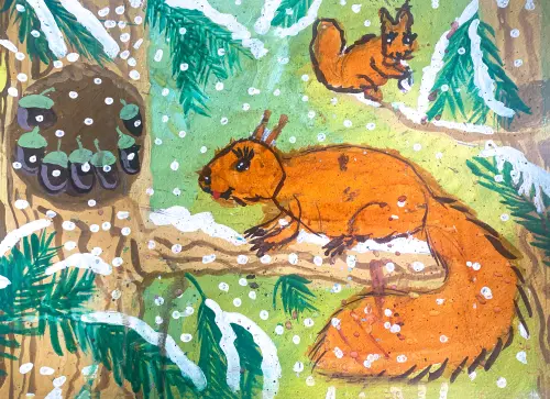 Очень много белочек живет на нашей Берёзовой аллее, мы все их подкармливаем зимой, приносим им орешки, хлеб. Они их уносят к себе в домики на дереве