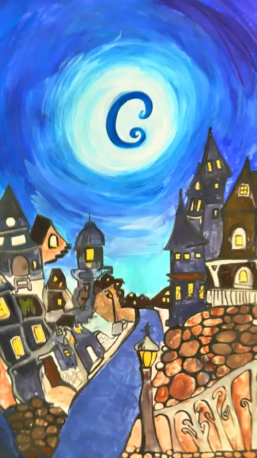 Меня зовут Серёжа и я хочу рассказать о своем рисунке. Я нарисовал не просто ночной город, это целый новый мир, который оживает тогда, когда заходит солнце. В центре моей картины - гордая луна. Это моя любимая часть рисунка, я долго смешивал краски, чтобы получить этот бархатистый и глубокий оттенок.