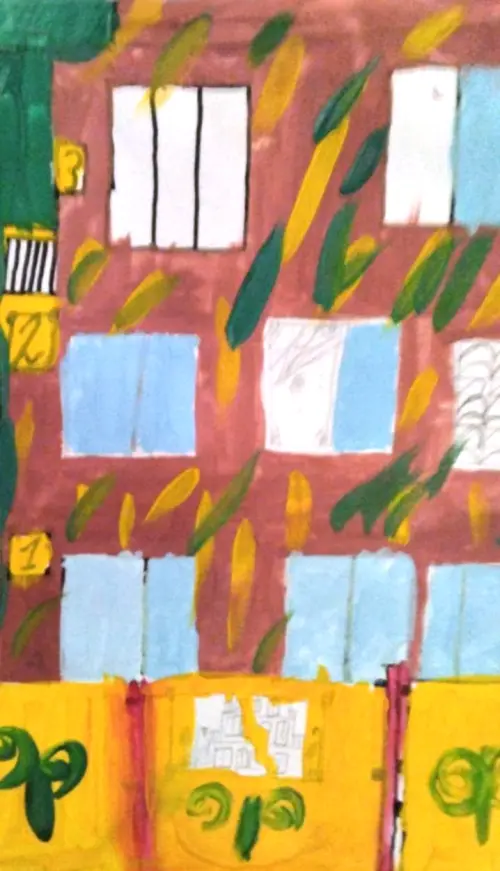 Я Алёша, и на своём рисунке и изобразил дом, в котором я живу. Он большой, в нём много квартир и окон. А ещё у некоторых квартир есть балконы, у нас он тоже есть. Я часто выношу своего кота по имени Юка на балкон, чтобы он мог посмотреть на машины и на птичек. Ещё на моей картине я изобразил падающие с деревьев листья.