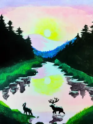 Тёплые оттенки рисунка и мягкие линии передают атмосферу летнего дня, а внимательная проработка деталей — пушистых хвостиков и длинных ножек оленят — показывает, с какой любовью юный художник подошёл к созданию этой трогательной природной сцены.
