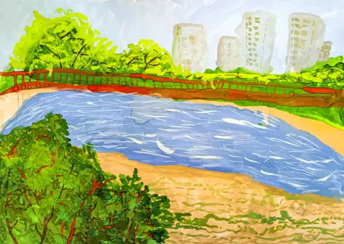 Эта река находится недалеко от нашего дома. Путь домой с занятий проходит как раз мимо этой реки. Каждый раз, глядя на неё, я замечаю, что река всегда выглядит по-разному: то залита лучами заходящего солнца, то окутана туманом. Иногда на реке проводятся занятия по гребному слалому. Часто по реке плавают толстые утки, которые совсем не боятся людей.