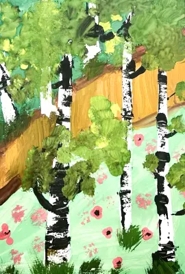 Гуляли с папой в парке около музея Победы. Дедушка рисовал на улице березки, мне понравилось и я тоже решил нарисовать дома, бабушка на стену повесила на даче.