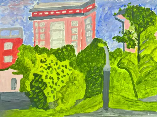 В своей картине я хотела показать всю красочность города, где можно увидеть многоэтажные дома в зелёном районе Москвы. Это вид из окна, который мне очень нравится.