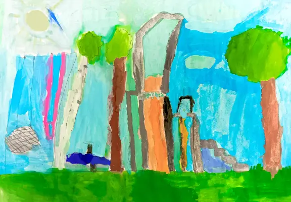 Я посещаю много разных кружков, но так порой хочется просто отдохнуть от занятий. Просто гулять бывает скучно, и моё внимание привлекает детская площадка. Качели и горки - всё это помогает всласть набегаться, напрыгаться и просто от души отдохнуть. Очень нравится мне площадка возле нашего дома. Её и решила нарисовать.
