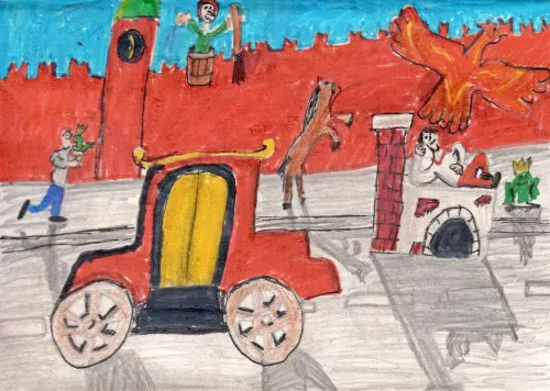 Москва - сказочная! Именно такой я её вижу, когда гуляю по городу. Вместо машин я представляю кареты, колесницы, Емелю на печке, в небе Жар-птица, стрелы Иванушки-дурачка, баба Яга и многие другие сказочные персонажи - все живут в моём городе и делают его невероятно ярким и красочным!