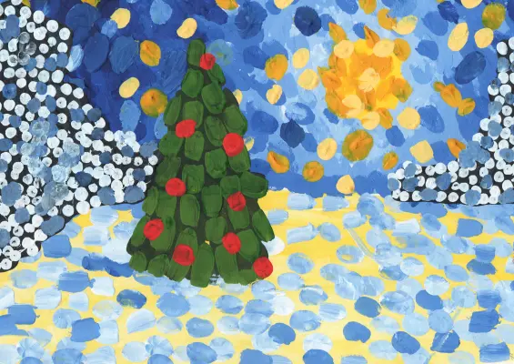 Рисунок «Новогодняя ёлка в Рогово» – это трогательное воплощение детского восторга и предвкушения праздника. На листе бумаги, словно запечатлённый момент из сказки, предстаёт перед нами нарядная ёлка, установленная, вероятно, в уютном доме или, может быть, в деревенском клубе села Рогово.