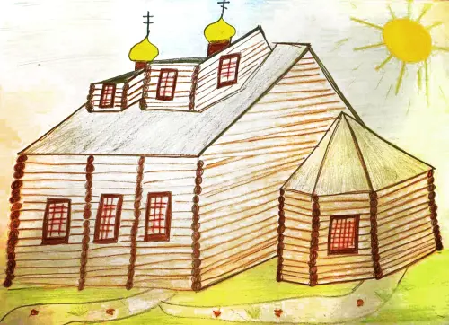 Я очень люблю рисовать, особенно значимые места района. В данном рисунке я изобразила церковь, она построена по старинному ладу, вся из дерева, с золотыми куполами.