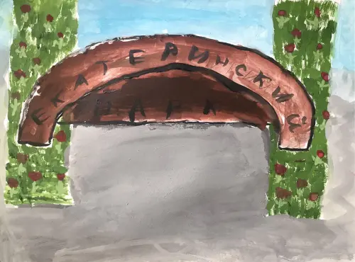 Я нарисовала вход в парк. Екатерининский парк мы любим всей семьей – кормим уточек, гуляем по дорожкам среди вековых деревьев, я обожаю кататься на самокате в парке и играть с друзьями на детской площадке.