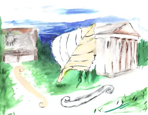 Акварельное изображение объединяет символику и архитектурные элементы, связанные с историко-культурным наследием района Марфино. В центре композиции — стилизованный лист, выполненный в жёлто-белых тонах, отсылающий к гербу Марфино, который символизирует природную красоту и историческую самобытность местности.