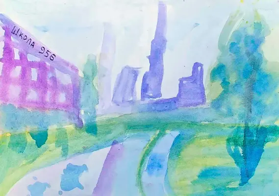 Акварельная техника без карандаша, описывает то, что видит ребенок из своего окна. В школе она учится, в парке неподалеку она гуляет с друзьями, летом играет в догонялки, зимой лепит снеговиков.