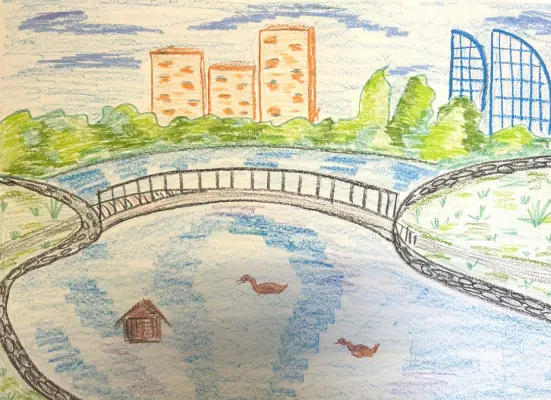 Рядом с моим домом есть парк «Дружба», там очень красиво, в любое время года мне нравится там гулять с родителями и друзьями. Вид, который я изобразила на картине мне особенно нравится — современная архитектура и умиротворенная природа.