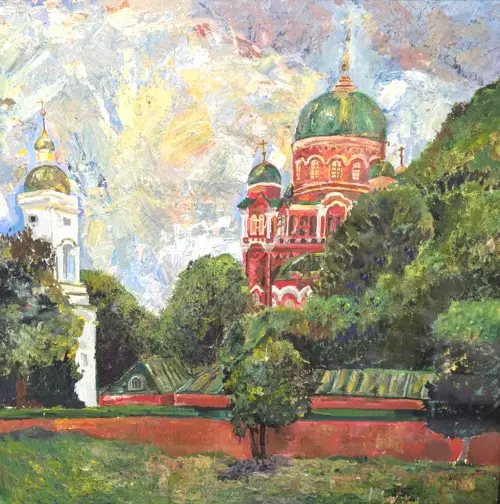 Картина выполнена в технике масляная живопись, на картине изображен храмовый ансамбль в летнее время, так же видны домики для паломников, прихожан и служителей церкви.